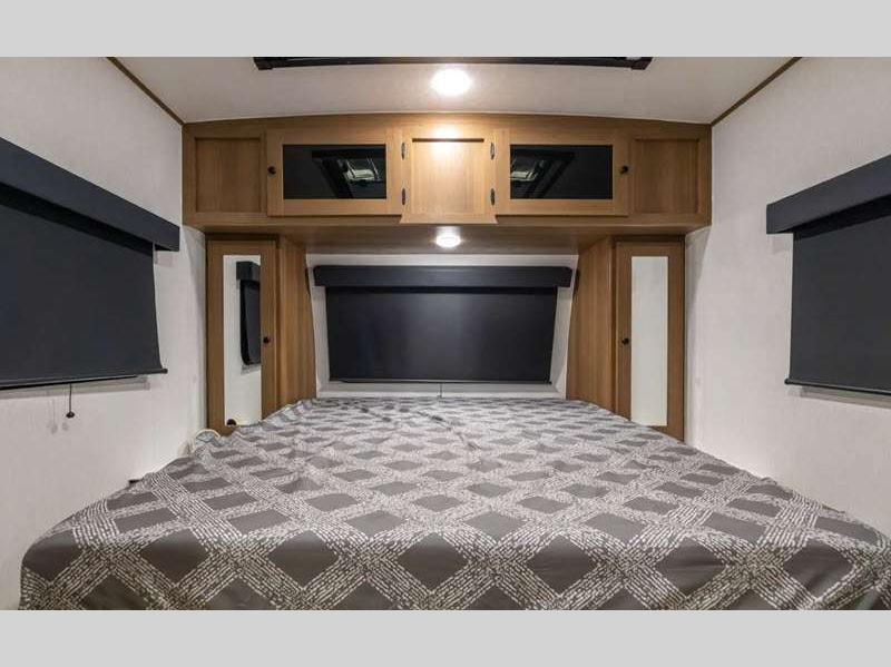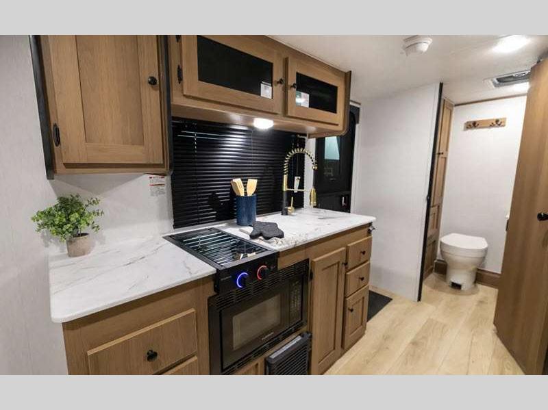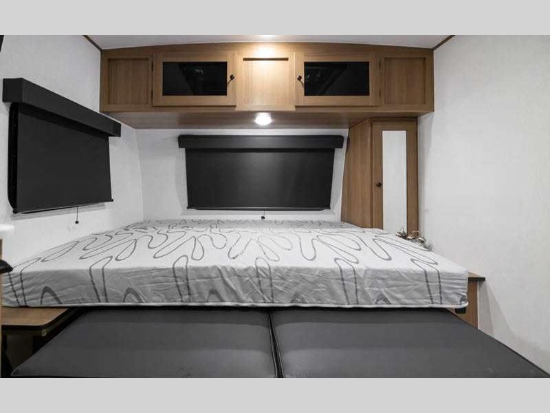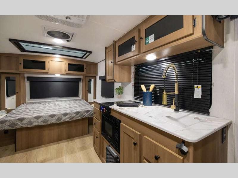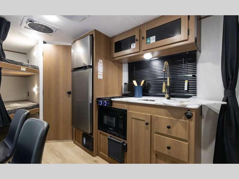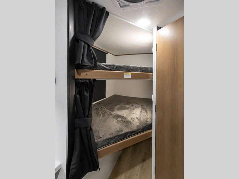 Sleeps 5 Slides 1 Length 22 ft 8 in Ext Width 7 ft 6 in Ext Height 9 ft 10 in Hitch Weight 428 lbs GVWR 4800 lbs Dry Weight 3634 lbs Cargo Capacity 1166 lbs Fresh Water Capacity 52 gals Grey Water Capacity 27 gals Black Water Capacity 27 gals Number Of Bunks 2 Available Beds Queen Refrigerator Type 12V Refrigerator Size 8 cu ft Cooktop Burners 2 Number of Awnings 1 LP Tank Capacity 20 lbs Water Heater Type Tankless AC BTU 15000 btu Awning Info 14' Power w/LED Lights Axle Count 1 Number of LP Tanks 2 Shower Type Tub/Shower Combo Electrical Service 55 amp Similar Floorplans
