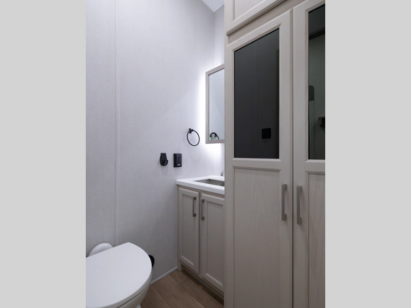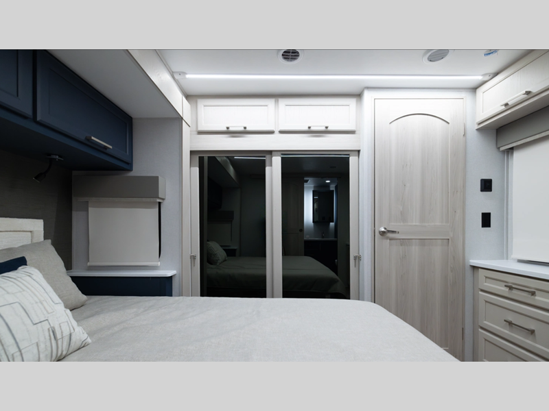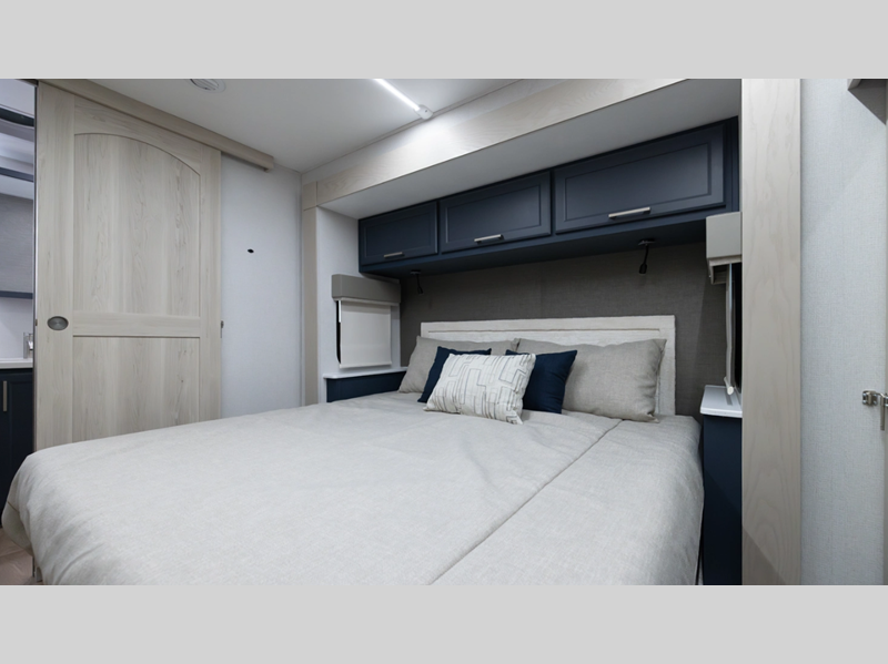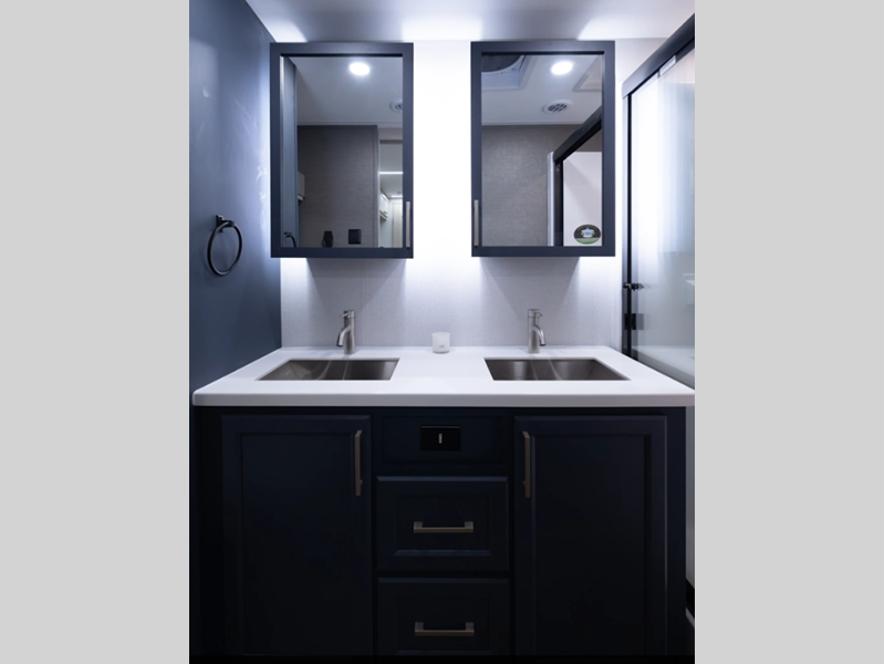Setting up is simple with the standard 6-point hydraulic leveling system, getting you settled in no time, and the slam latches on all storage doors paired with magnetic compartment holds make accessing your gear effortless. Outside, you'll also find a heated utility convenience center, 12V heat pads on all holding tanks for extended season camping, plus power awnings with LED lights. Inside, you are greeted with upgraded true solid surface countertops in both the kitchen and bath, soft close hidden-hinge reinforced doors and drawers with upgraded hardware, and dimmable ceiling strip lighting with three independent zones to set the perfect mood.