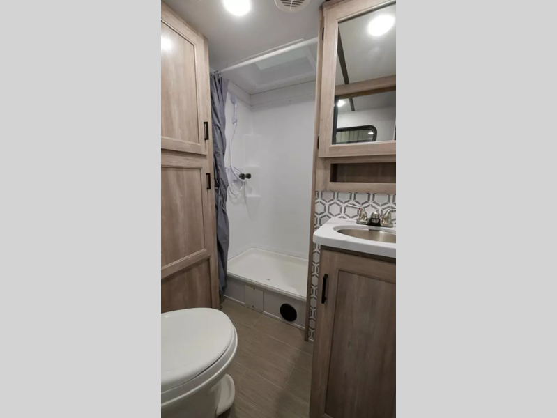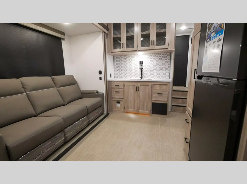 There is fiberglass flooring insulation that will withstand your many adventures plus a rear beaver tail frame for easy unloading and an external fuel cell with a pump. You will feel right at home with decorative glass cabinet doors and LED lights, and there is a tankless water heater to provide endless hot showers after trail riding. The Alumifoil insulated enclosed underbelly will help extend your camping season, and each model is back up camera ready if you want to make parking easier than ever.